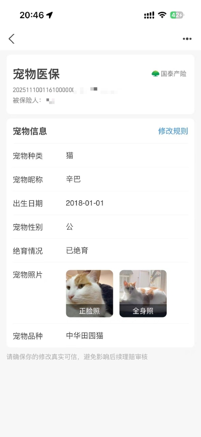 月缴保单和平台页面明赫然示被保障宠物是橘白猫“辛巴”,国泰产险却坚称被保障宠物是狸花猫“居居”。因为下单宠物医保时的一次信息错填,即便按照保障销售平台司法坐窝修正了信息,上海市民柳女士仍在几个月后的理赔阶段遭阻,堕入“并非换猫”的自证难题。新闻晨报·申度新闻记者介入后,国泰产险查明是系统新旧版块迭代导致客户的保单场合调动出现问题,之后也马上向柳女士进行了理赔。