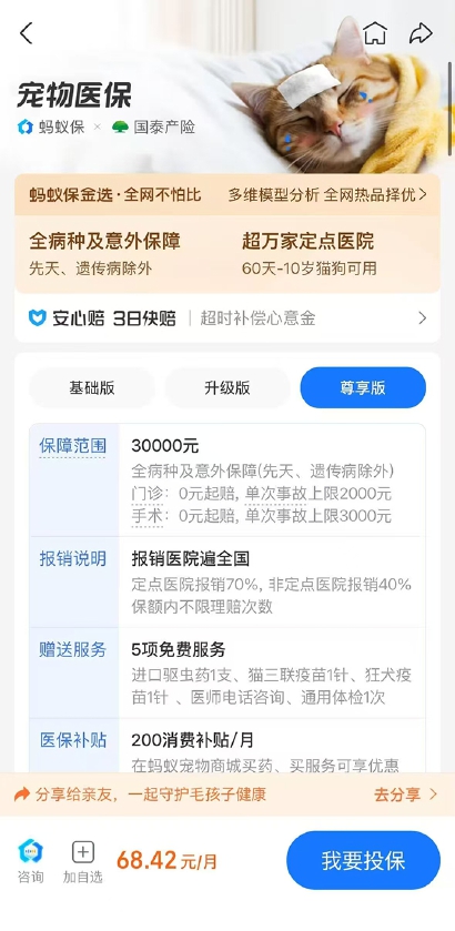 保障确定页表露,上述保障每月需缴费68.42元,可保障的规模包括宠物偶然、日常疾病调养(不含先天、遗传疾病),可在定点病院报销70%用度。“宠物看病用度正本就不低,买份保障亦然增添一份保障。”怀着这么的激情,柳女士决定投保。