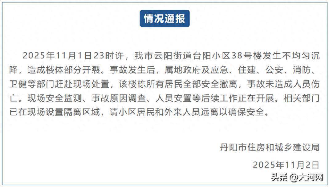 2025年11月1日23时许,我市云阳街谈台阳小区38号楼发生不均匀千里降,形成楼体部分开裂。事故发生后,属地政府及济急、住建、公安、消防、卫健等部门前往现场解决,该楼栋统共住户一起安全猬缩,事故未形成东谈主员伤一火。