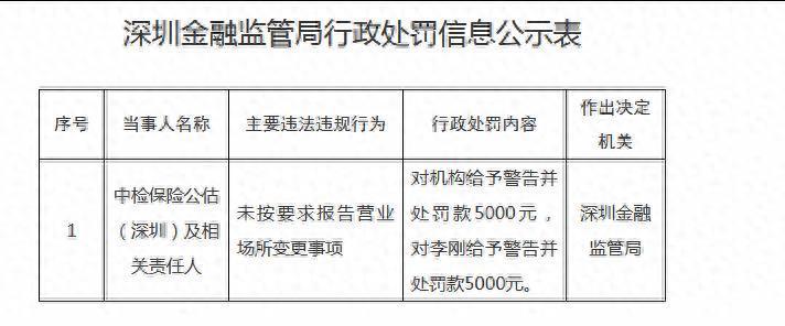 11月18日,深圳金融监管局发布的行政处罚信息公示表走漏,因未按条目诠释商业场面变更事项,中检保障公估(深圳)及策动包袱东说念主李刚受到行政处罚。具体处罚推手脚,对中检保障公估(深圳)赐与告诫并处罚金5000元,对李刚赐与告诫并处罚金5000元。