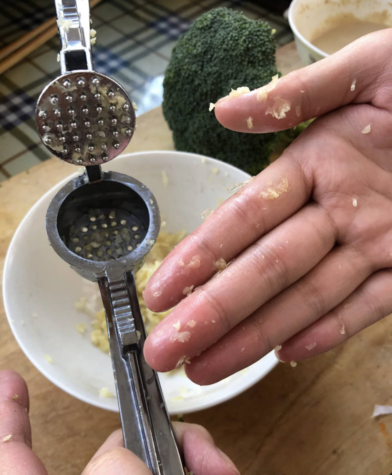 并且压一个,压蒜器上粘1/3,手上再粘1/3,能用的也未几了。