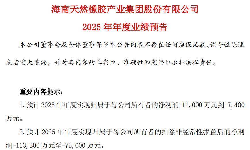 当日晚间,海南橡胶(601118)却抛出预亏公告,经财务部门初步测算,展望2025年年度完毕归母净利润-11,000万元到-7,400万元,2024年归母净利润1.03亿元。展望2025年年度扣非净利润-113,300万元至-75,600万元。