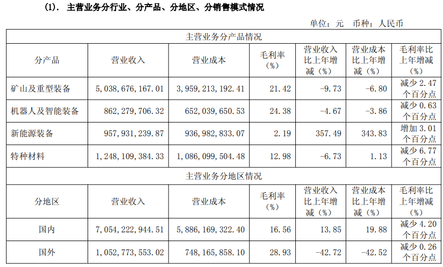 年报潜入,公司占比最大的主业矿山及重型装备终了营收50.39亿元,同比下滑9.73%;当作第二弧线的机器东谈主及智能装备终了营收8.62亿元,同比下滑4.67%;新动力装备固然营收同比大增357%,但和机器东谈主及智能装备相通基数较低,盈利较弱,短期难托举座;特种材料终了营收12.48亿元,同比下滑6.73%。